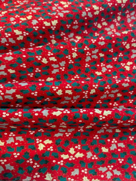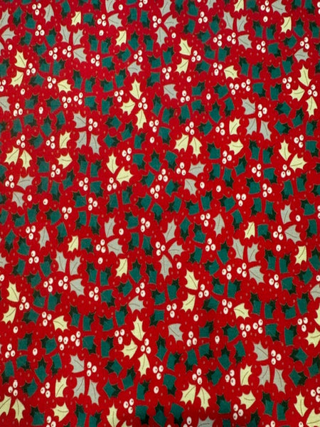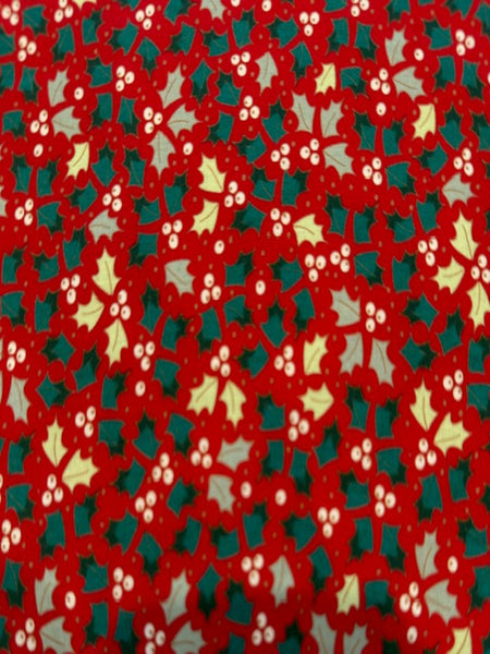 - Christmas Mixed Green Small Hollies on Red Cotton