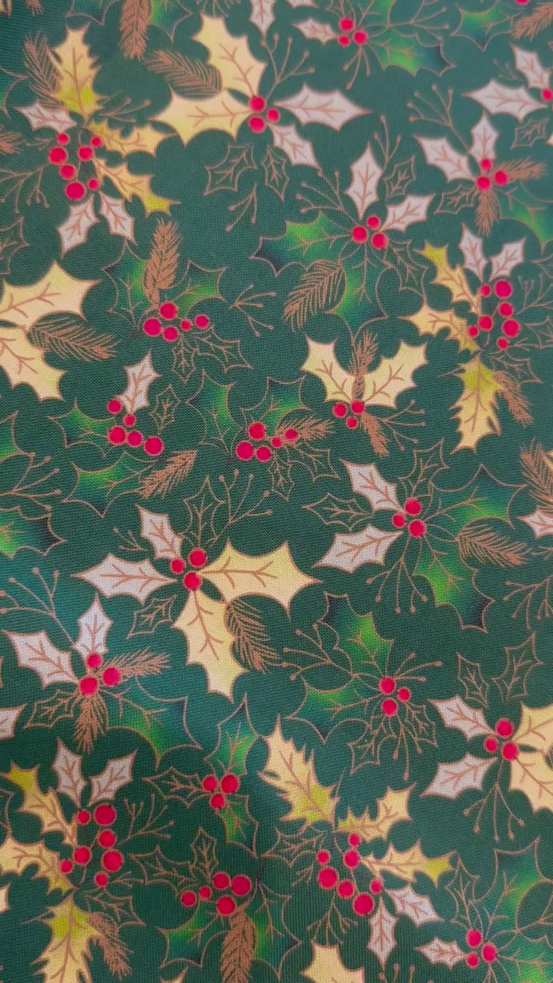 Deck the halls with festive charm! This Christmas Green Hollies fabric features a classic holly pattern on a vibrant green background, perfect for creating holiday décor, festive clothing, quilts, table runners, and seasonal crafts.