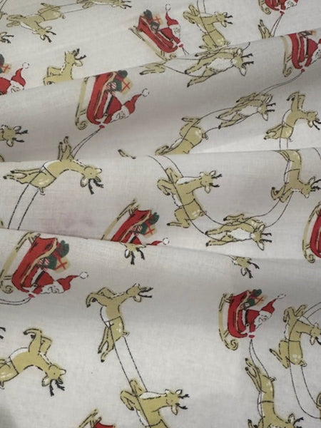 Santa Sleigh & Reindeer on White Poly/Cotton